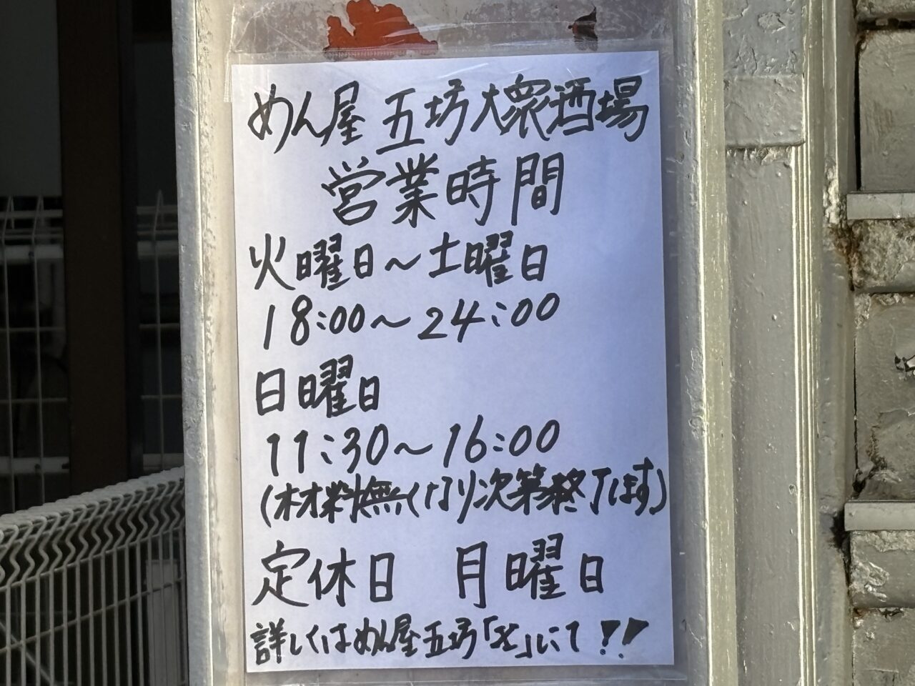 「めん屋 五坊」の営業時間は11:30~15:00(材料が無くなり次第終了)、「五坊大衆酒場」の営業時間は14:00~21:00となっており、定休日は月曜日と火曜日になります。