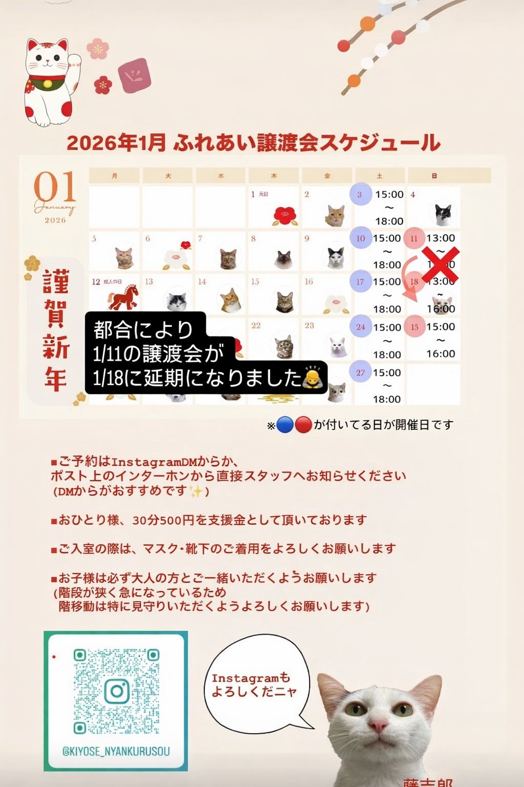 ふれあい譲渡会の予約については、下の「にゃん来る荘」のInstagramからのDMか、「にゃん来る荘」のインターホンより直接スタッフにお伝えください。